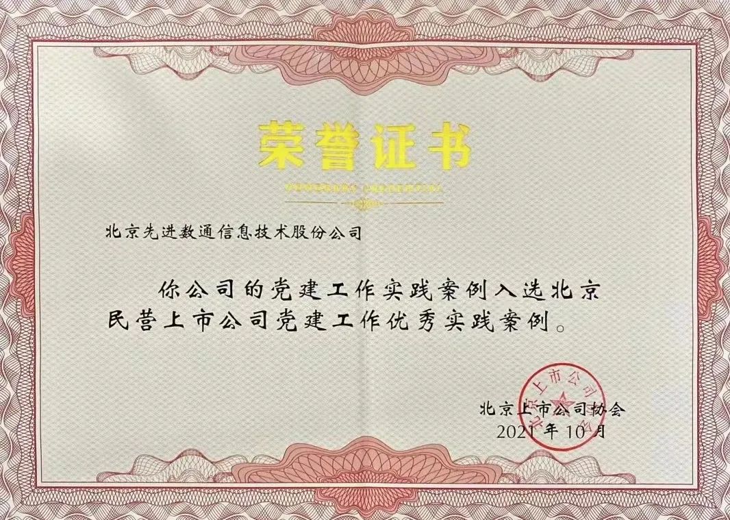 近期,北京上市公司协会授予北京凯发k8国际信息技术股份公司荣誉证书,凯发k8国际党建工作实践入选北京民营上市公司党建工作优秀实践案例,相关党建活动已收录在《北京民营上市公司党建工作优秀实践案例汇编》。